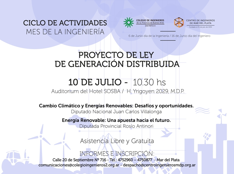Invitamos al Ingeniero Electricista Martin Ponza Matricula N° 55024, Consultor Independiente, quien nos informa de los avances en el Mercado Eléctrico de las Energías Renovables y de los avances del Proyecto de Ley sobre Generación Distribuida que hoy se debate en la Legislatura Nacional.